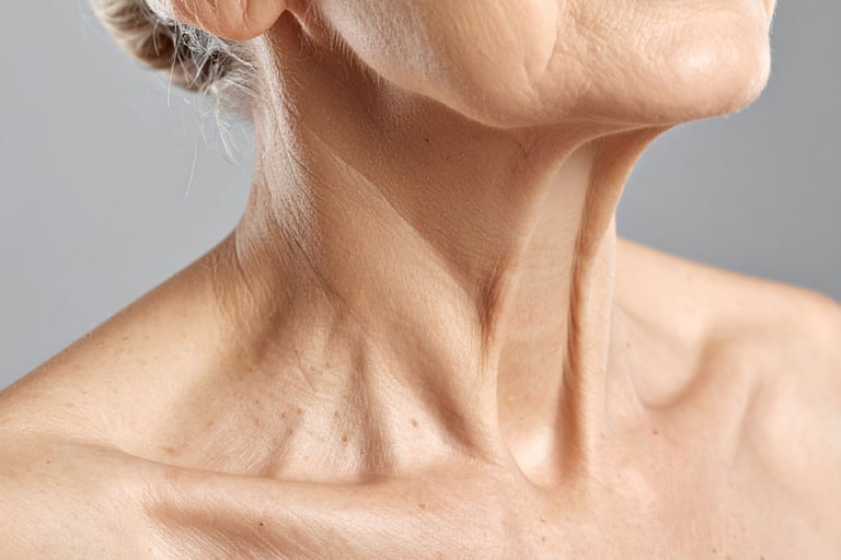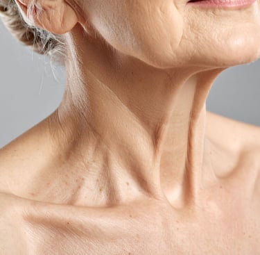 Le cou est également exposé au vieillissement, entraînant l'apparition de rides horizontales. Il peut être amélioré grâce à des injections d'acide hyaluronique de type Profhilo en 2 séances, ainsi qu'avec un inducteur de collagène.